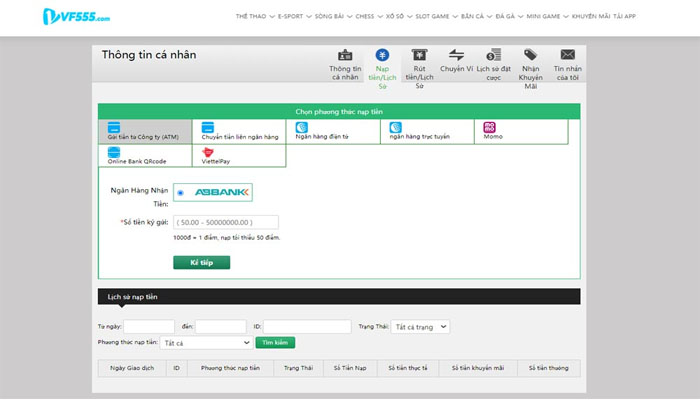 - Bước 2: Chọn danh mục nạp tiền ngay trên góc phải của trang chủ nhà cái Vf555. Nhà cái sẽ chuyển bạn đến một trang nạp tiền mới để tiến hành thực hiện giao dịch.